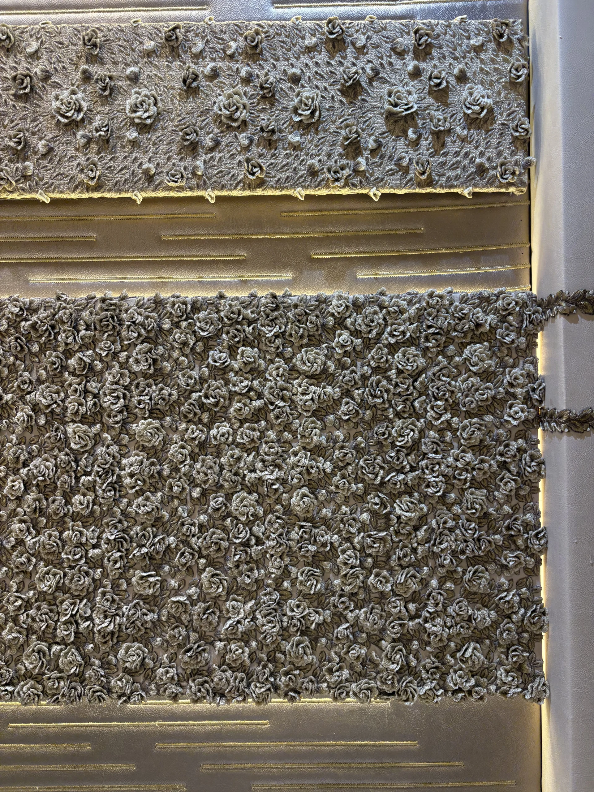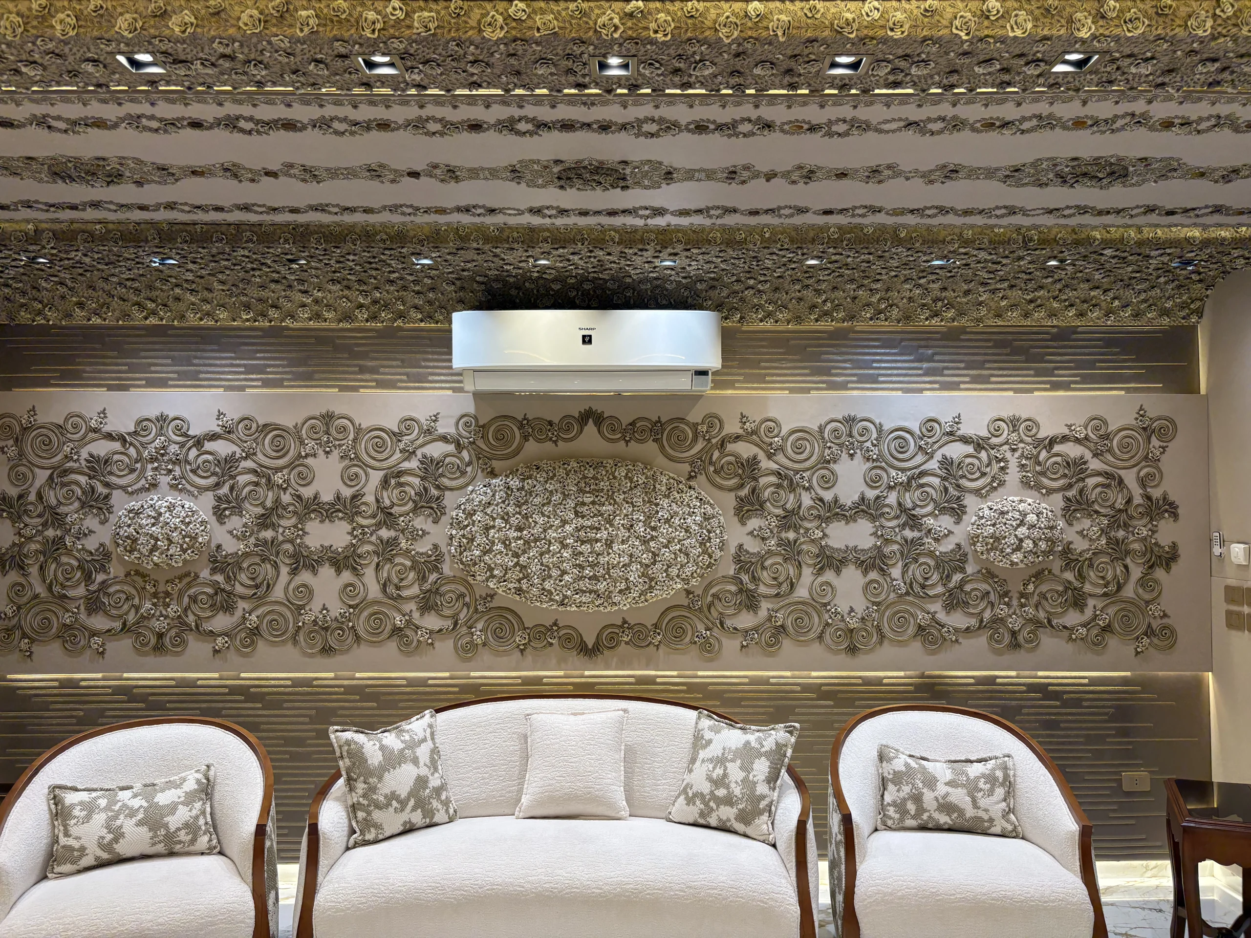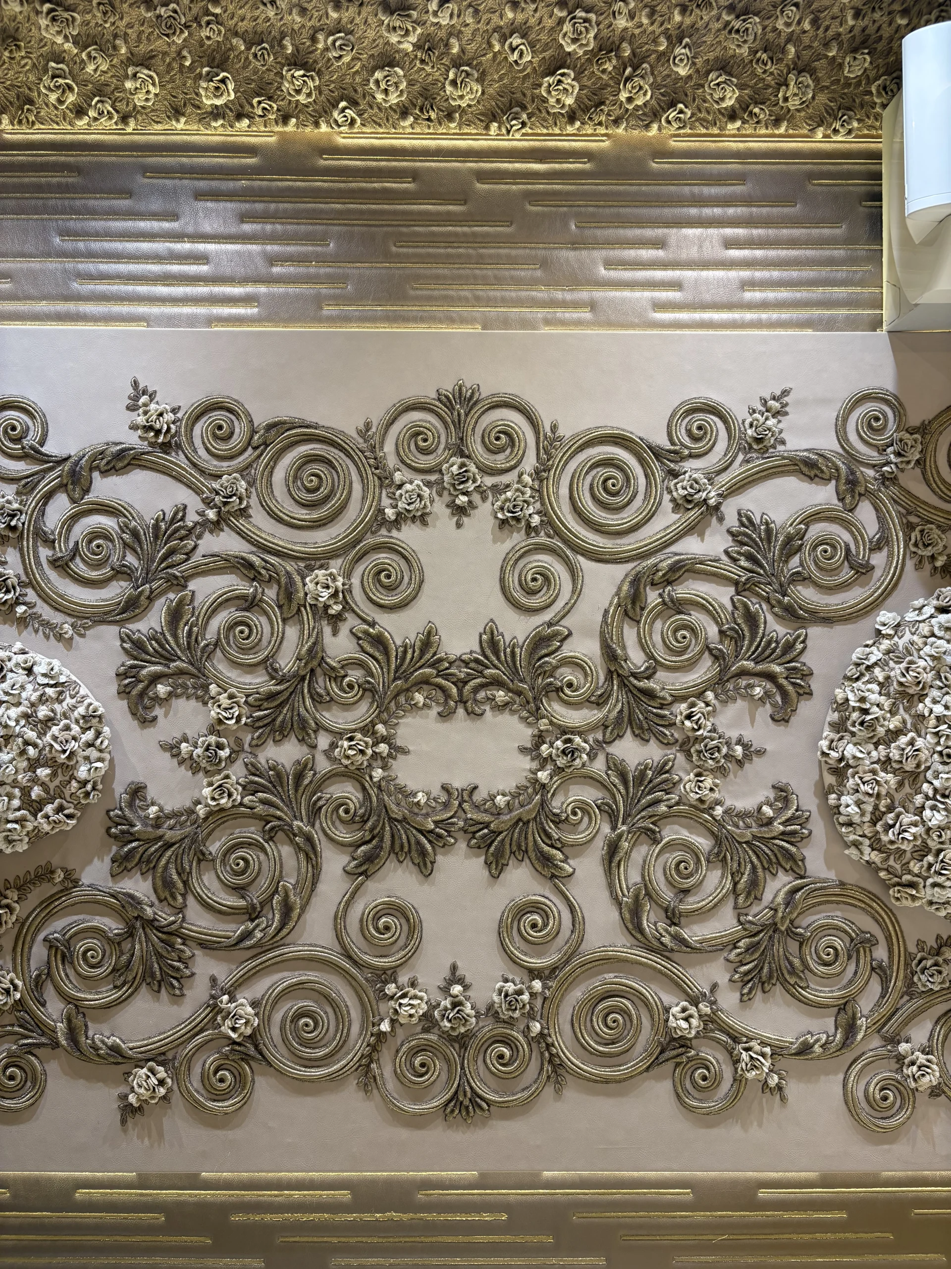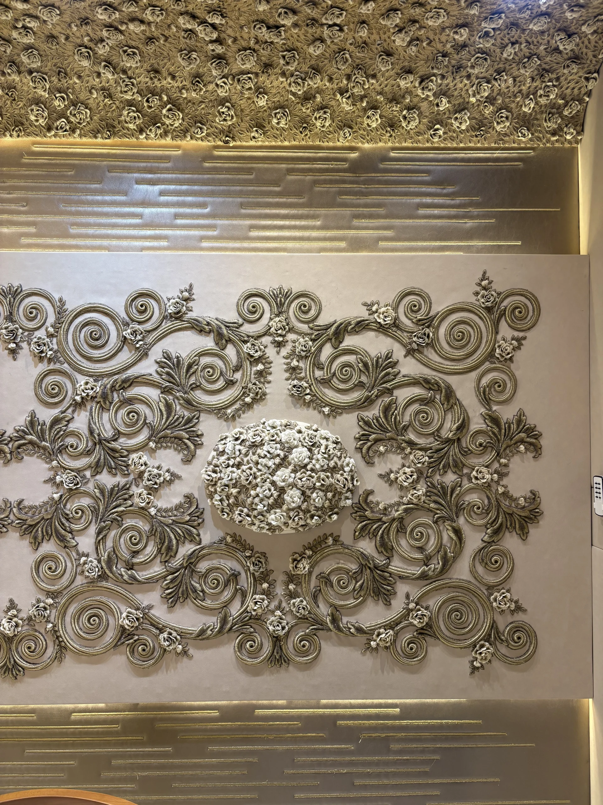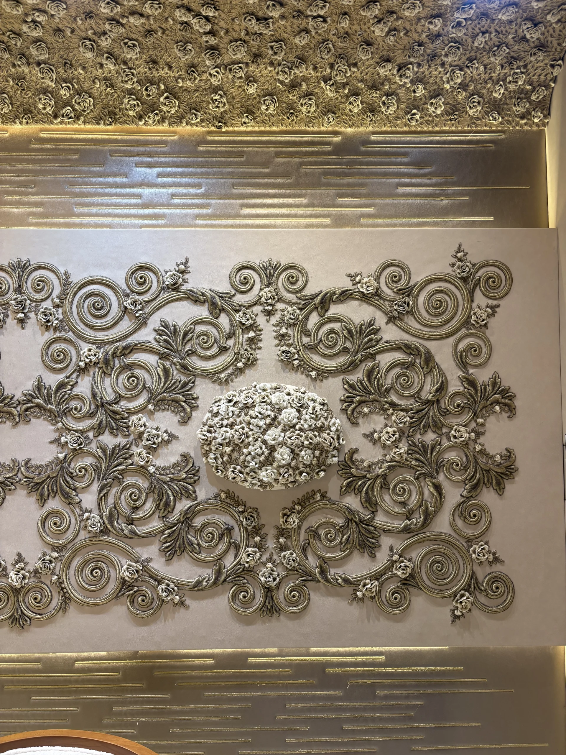 حائط مزخرف بتطريز كثيف في المنتصف مع إطار من زخارف كلاسيك حوالين العنصر الرئيسي.التصميم كله متناظر (يمين وشمال زي بعض) وده مديه شكل منظم ومريح للعين.