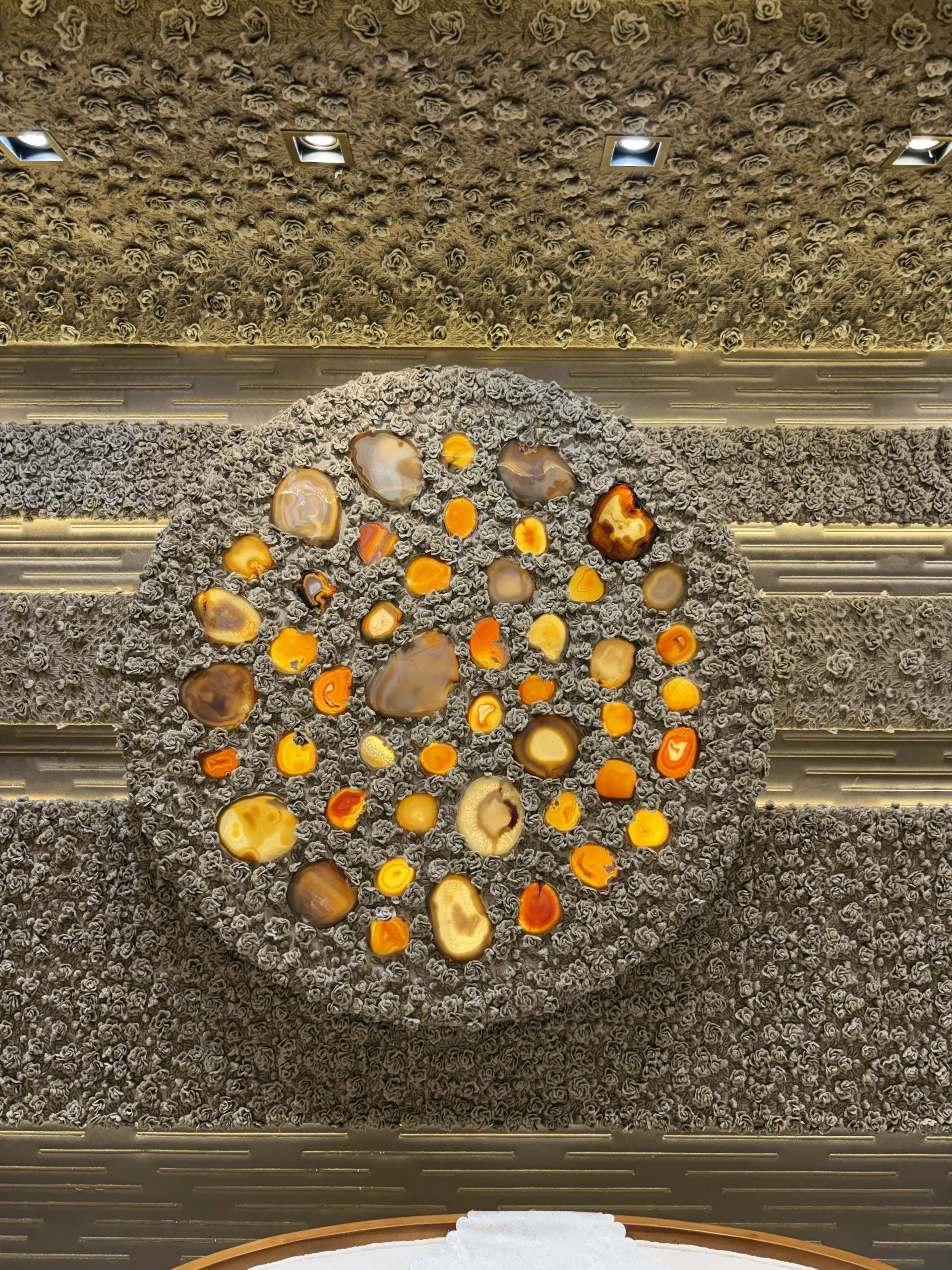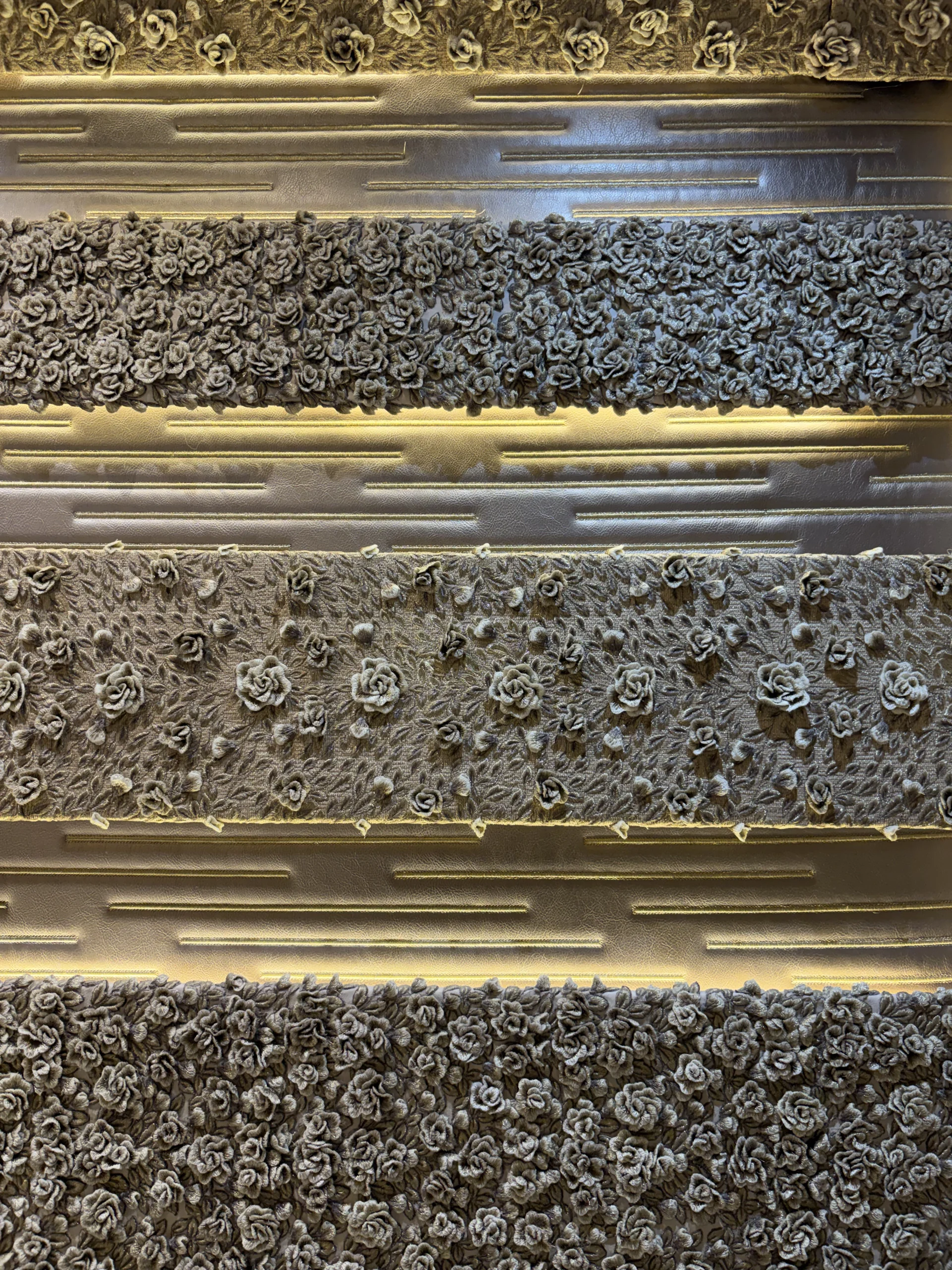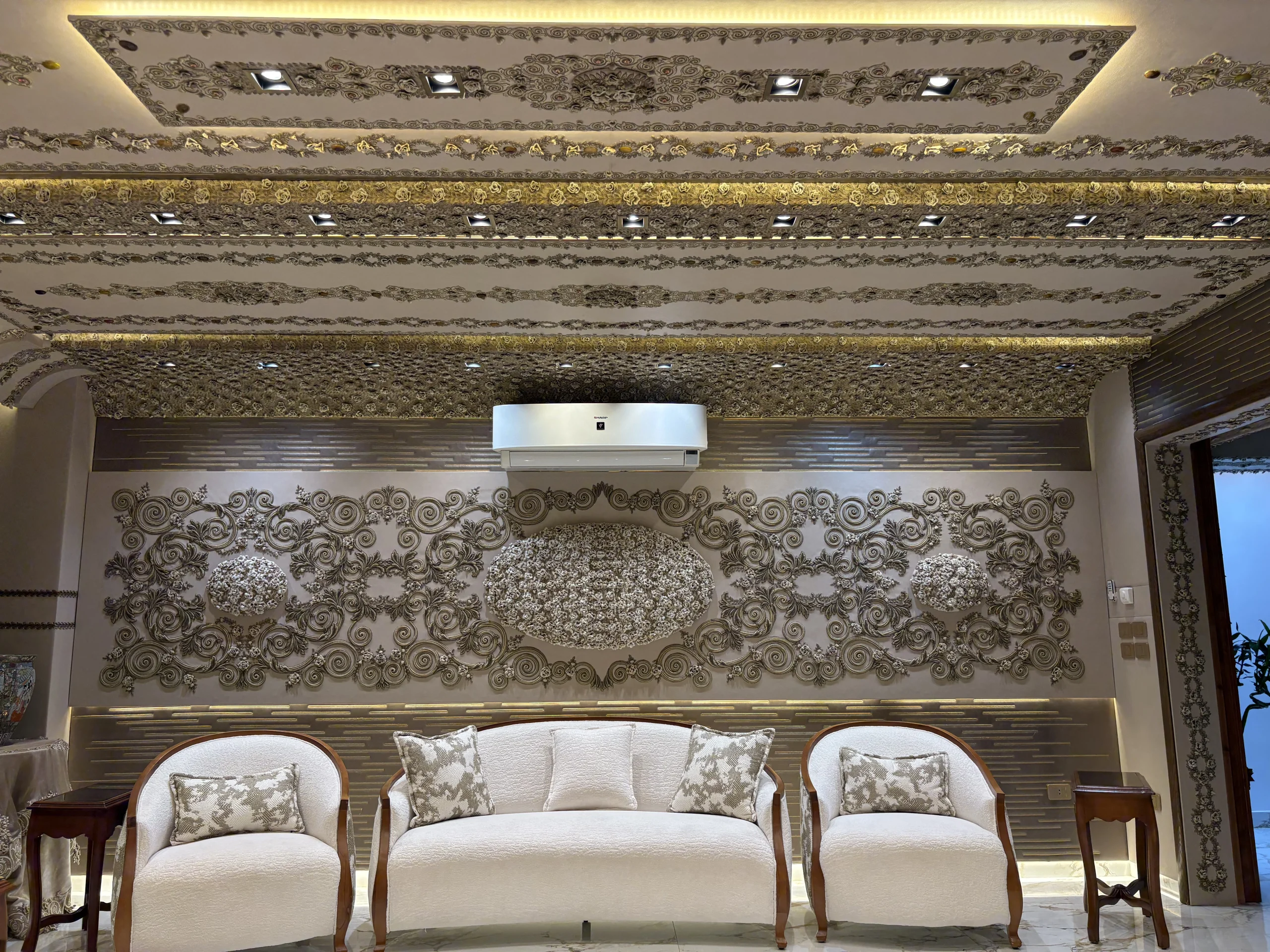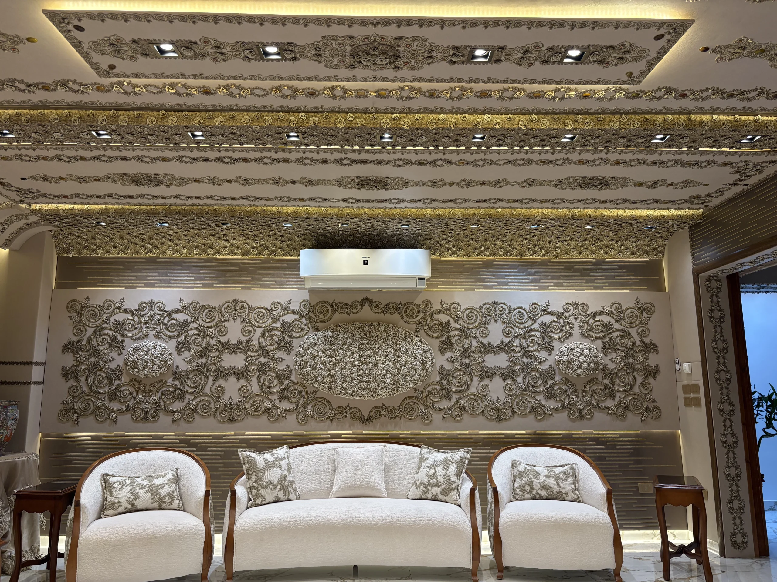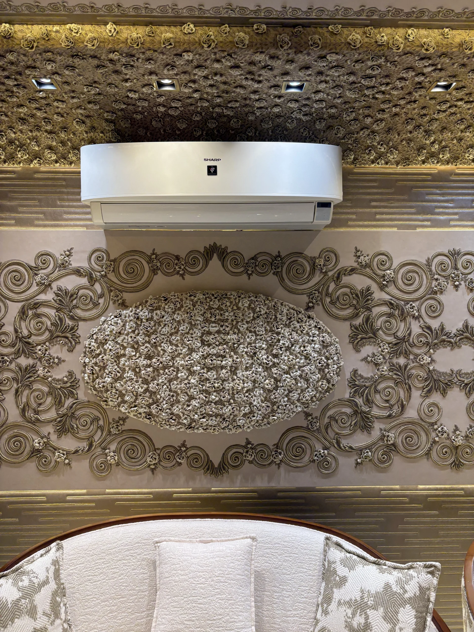 حائط مزخرف بتطريز كثيف في المنتصف مع إطار من زخارف كلاسيك حوالين العنصر الرئيسي.التصميم كله متناظر (يمين وشمال زي بعض) وده مديه شكل منظم ومريح للعين.